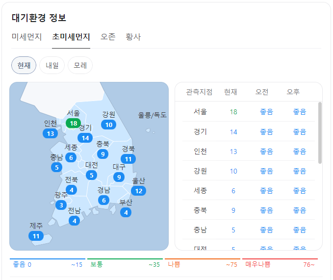 현재 초미세먼지는 위와 같습니다. 오전 예보, 오후 예보 모두 전국이 좋음입니다.