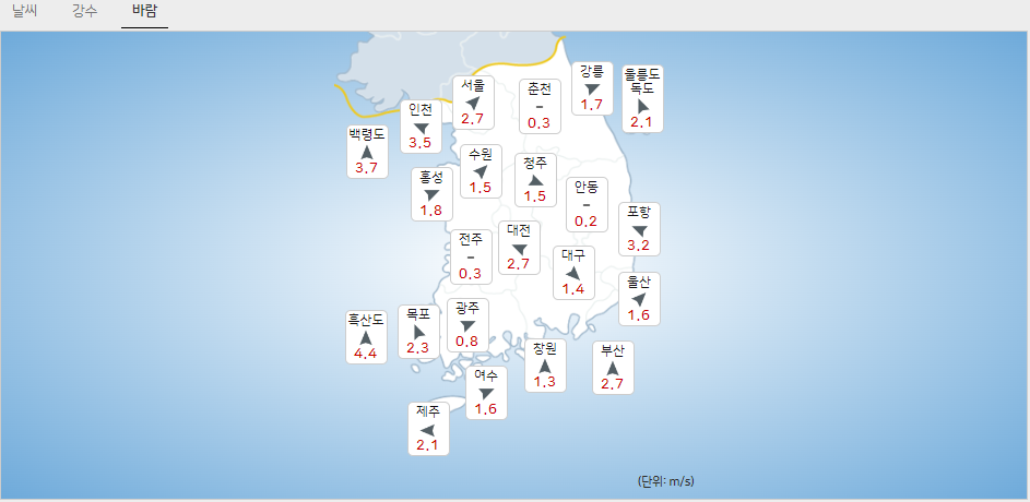 (강풍) 오늘(19일) 제주도, 내일(20일) 밤부터 모레(21일) 오전 사이 강원도, 모레 전국 대부분 지역에 바람이 순간풍속 55km/h(15m/s) 내외(산지 70km/h(20m/s) 내외)로 강하게 부는 곳이 있겠으니, 시설물 관리와 안전사고에 유의하기 바랍니다.