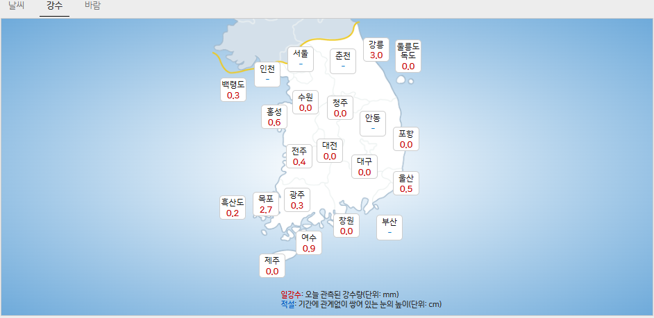- (강원도) 강원영동: 5mm 안팎/ 강원영서: 5mm 미만