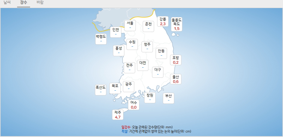 - (경상권) 경북북부동해안. 경북북동산지: 5~30mm/ 부산. 울산. 경남동부내륙, 경북남부동해안, 울릉도. 독도: 5mm 안팎