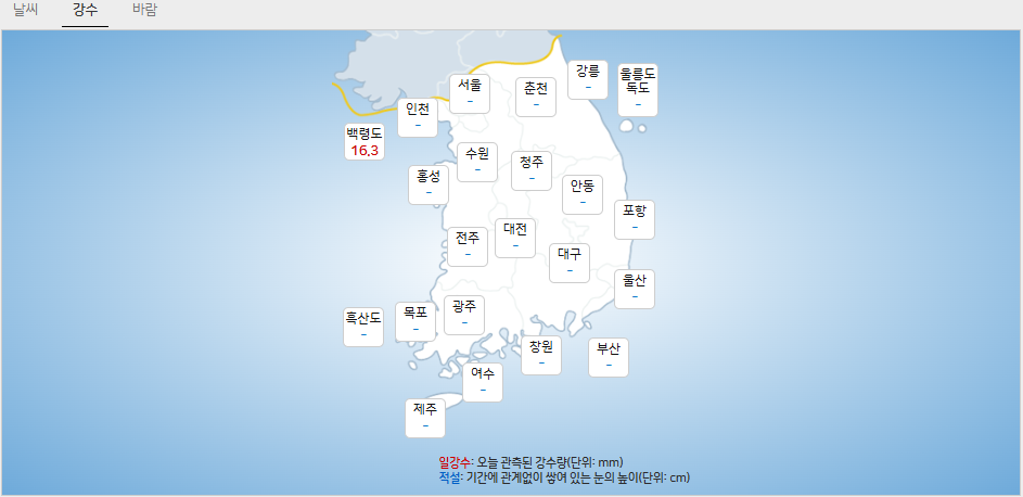- (수도권) 서해 5도: 5~20mm/ 인천. 경기서해안: 5mm 미만/ 서울. 경기내륙: 1mm 안팎