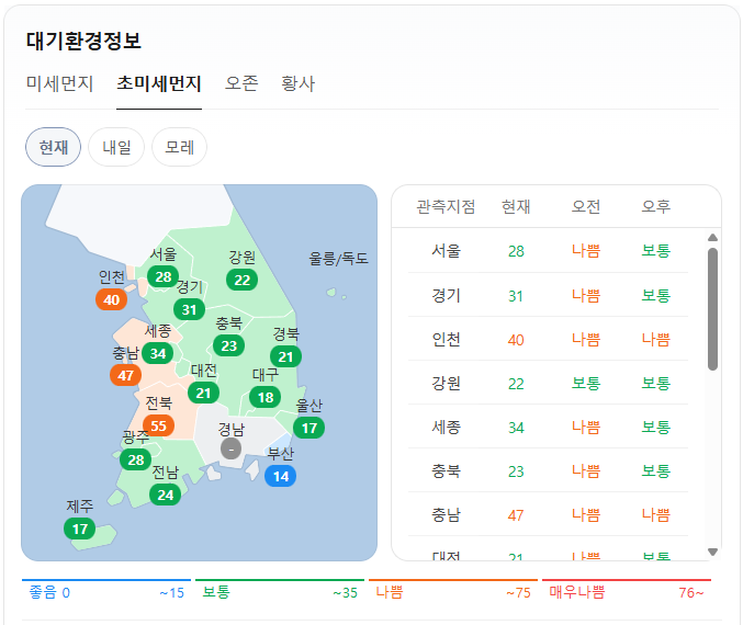 현재 초미세먼지는 위와 같습니다. 오전 예보는 서울, 경기, 인천, 세종, 충북, 충남, 대전, 전북은 나쁨이고, 그 외 지역은 보통입니다. 오후 예보는 인천, 충남, 전북은 나쁨이고, 울산, 부산, 제주는 좋음이며, 그 외 지역은 보통입니다.
