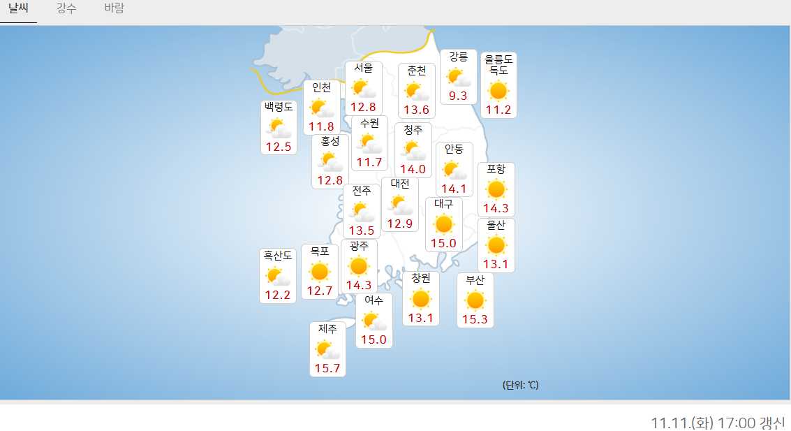 - 모레(13일) 아침최저기온은 1~11℃, 낮최고기온은 15~20℃가 되겠습니다.