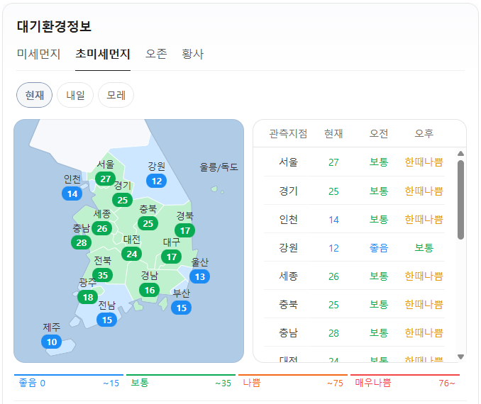 현재 초미세먼지는 위와 같습니다. 오전 예보는 서울, 경기, 인천, 세종, 충북, 충남, 대전, 전북은 보통이고, 그 외 지역은 좋음입니다. 오후 예보는 서울, 경기, 인천, 세종, 충북, 충남, 대전, 전북은 한때 나쁨이고, 그 외 지역은 보통입니다.