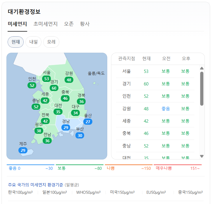 현재 미세먼지는 위와 같습니다. 오전 예보는 서울, 경기, 인천, 세종, 충북, 충남, 대전은 보통이고, 그 외 지역은 좋음입니다. 오후 예보는 전국이 보통입니다.