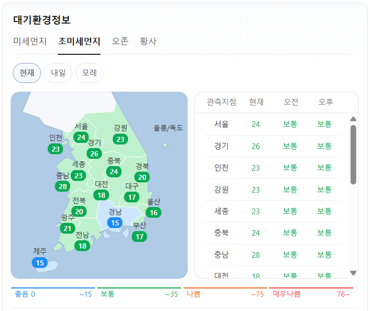 현재 초미세먼지는 위와 같습니다. 오전 예보, 오후 예보 모두 전국이 보통입니다.