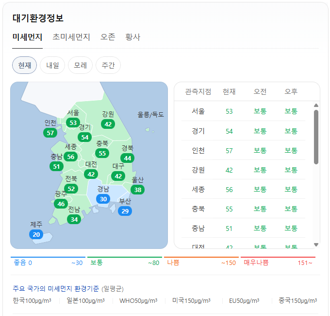 현재 미세먼지는 위와 같습니다. 오전 예보, 오후 예보 모두 전국이 보통입니다.