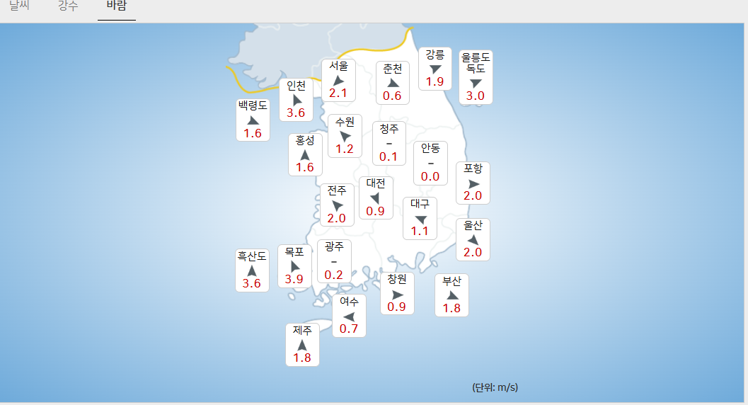 또한, 내일 그 밖의 전국 대부분 지역에도 바람이 순간풍속 55km/h(15m/s) 이상으로 강하게 부는 곳이 있겠으니, 시설물 관리와 안전사고에 유의하기 바랍니다.