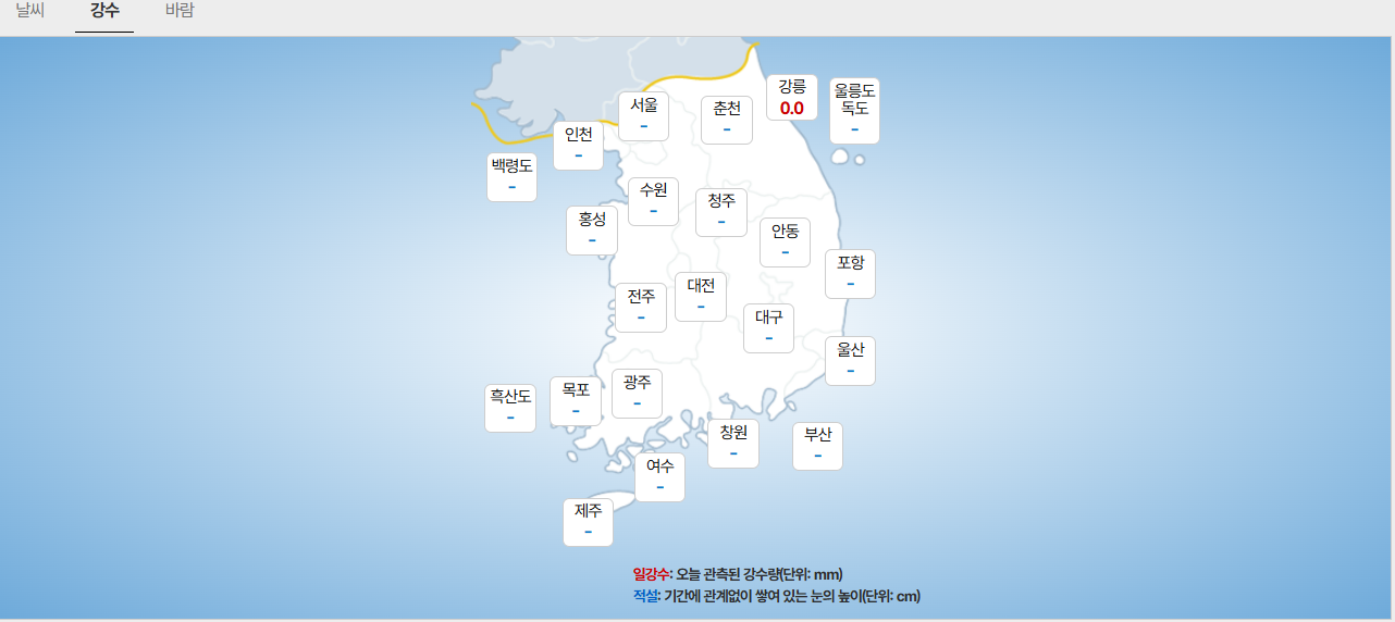 - (강원도) 강원내륙. 산지: 5~20mm/ 강원동해안: 5mm 미만