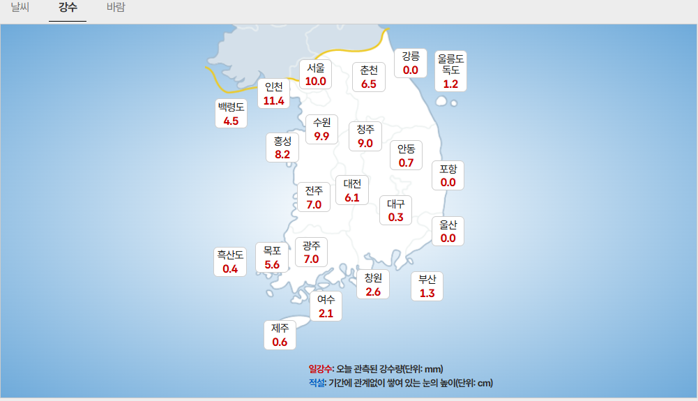 - (수도권) 서울. 인천. 경기: 5mm 미만/ 서해 5도: 1mm 미만