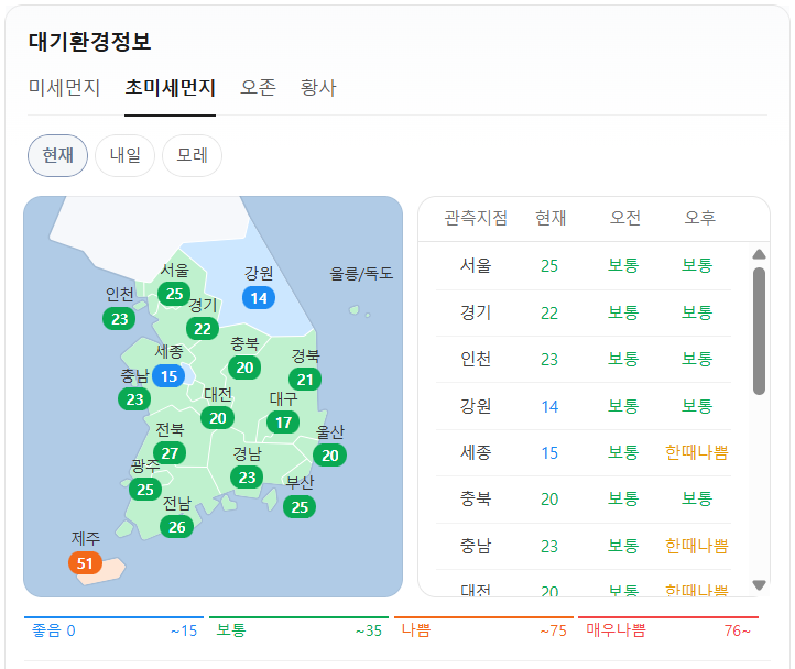 현재 초미세먼지는 위와 같습니다. 오전 예보는 전국이 보통입니다. 오후 예보는 세종, 충남, 대전, 전북, 전남, 광주는 한때 나쁨이고, 제주는 나쁨이며, 그 외 지역은 보통입니다.