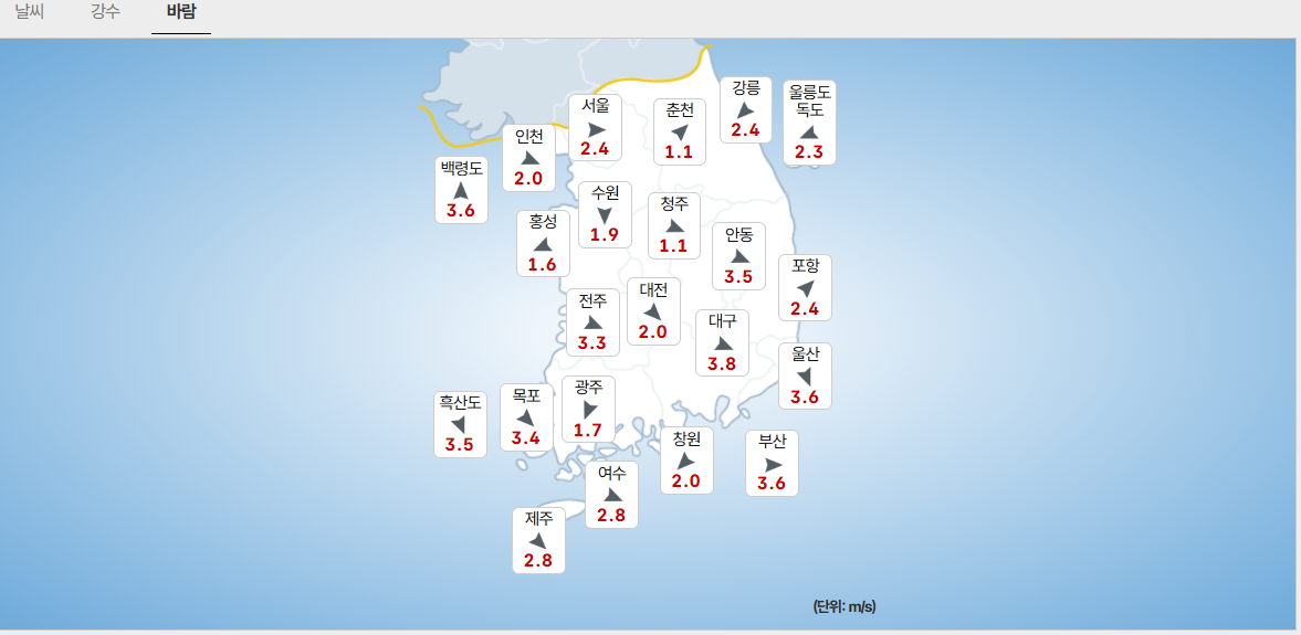 (강풍) 오늘(28일) 오전까지 전국 대부분 지역에, 내일(29일) 오후부터 강원영동에 바람이 순간풍속 55km/h(15m/s)(강원산지 70km/h(20m/s)) 이상으로 강하게 부는 곳이 많겠으니, 시설물 관리와 안전사고에 유의하기 바랍니다.