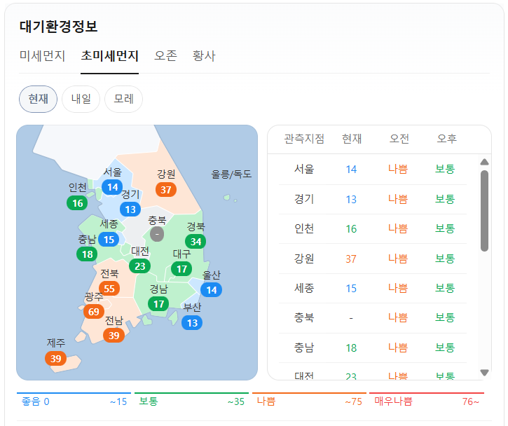 현재 초미세먼지는 위와 같습니다. 오전 예보는 경남, 울산, 부산, 전남, 제주는 보통이고, 대구, 광주는 한때 나쁨이며, 그 외 지역은 나쁨입니다. 오후 예보는 전국이 보통입니다.