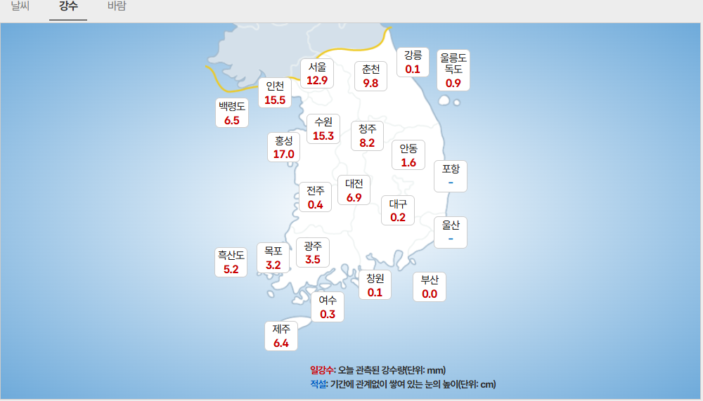- (강원도) 강원내륙. 산지: 5~10mm/ 강원동해안: 5mm 안팎