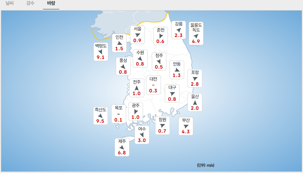 (해상) 오늘(11일) 오전부터 서해 먼바다와 서해중부 앞바다, 동해중부 먼바다, 동해남부북쪽 먼바다에, 오후부터 서해남부 앞바다와 남 해서 부서 쪽 먼바다, 동해중부 앞바다, 경북 앞바다에, 밤부터 내일 새벽 사이 그 밖의 대부분 해상에도 바람이 30~65km/h(9~18m/s)로 매우 강하게 불고, 물결이 1.5~5.0m로 매우 높게 일면서 풍랑특보를 발표할 가능성이 있겠으니, 항해나 조업하는 선박은 각별히 유의하기 바라며, 앞으로 발표하는 기상정보를 참고하기 바랍니다.
