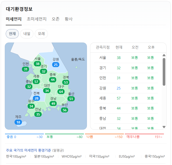 현재 미세먼지는 위와 같습니다. 오전 예보, 오후 예보 모두 전국이 보통입니다.