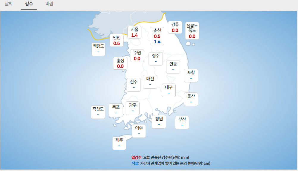 - (수도권) 경기남부: 5mm 미만/ 서울. 인천. 경기북부: 1mm 안팎