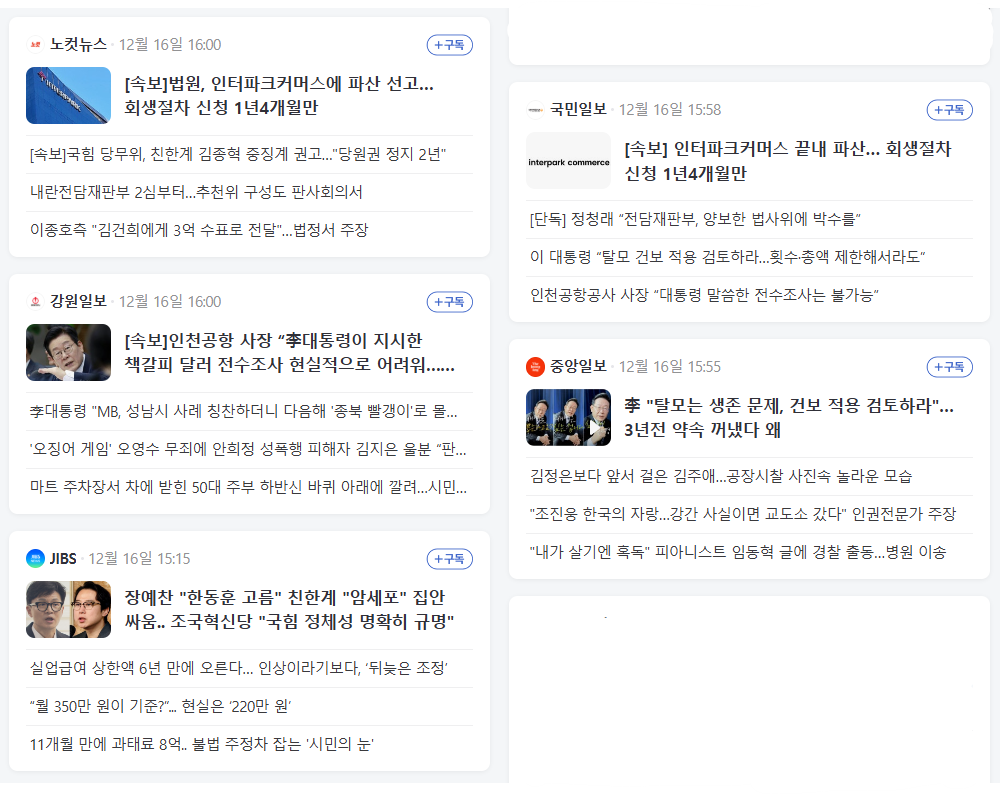 오늘 현재의 뉴스 헤드라인입니다.