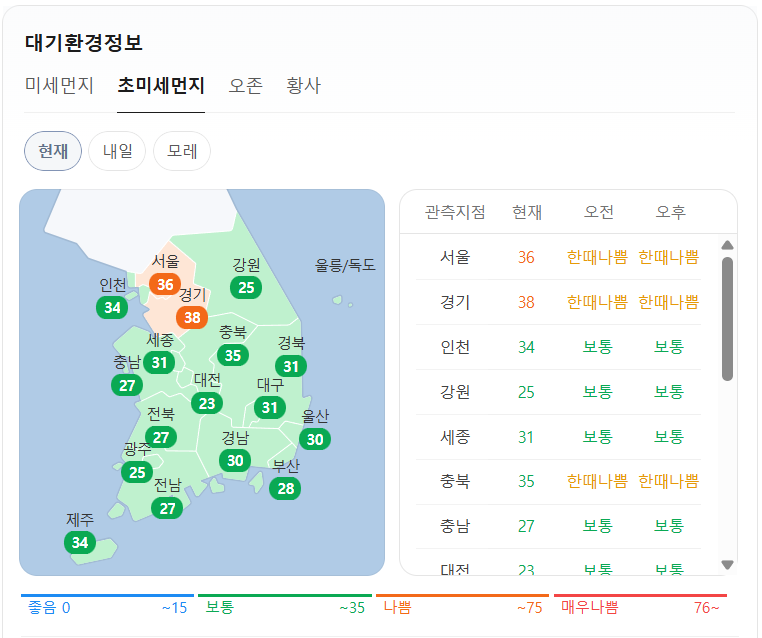 현재 초미세먼지는 위와 같습니다. 오전 예보, 오후 예보 모두 서울, 경기, 충북은 한때 나쁨이고, 그 외 지역은 보통입니다.