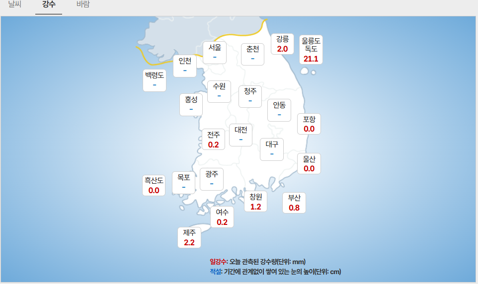 - (경상권) (18일 새벽까지) 울릉도. 독도: 5mm 안팎/ 경북북부동해안. 북동산지: 5mm 미만