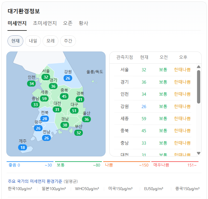 현재 미세먼지는 위와 같습니다. 오전 예보는 전국이 보토입니다. 오후 예보는 울산, 부산은 보통이고, 그 외 지역은 한때 나쁨입니다.
