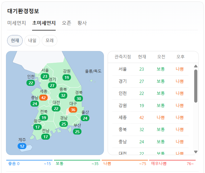 현재 초미세먼지는 위와 같습니다. 오전 예보는 세종은 나쁨이고, 그 외 지역은 보통입니다. 오후 예보는 울산, 부산, 제주는 한때 나쁨이고, 그 외 지역은 나쁨입니다.