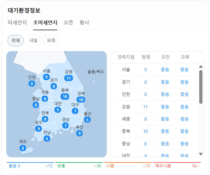 현재 초미세먼지는 위와 같습니다. 오전 예보, 오후 예보 모두 전국이 좋음입니다.