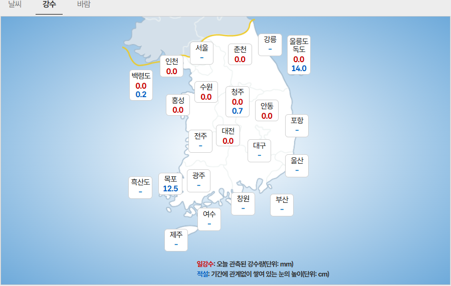 또한, 내일(13일) 새벽(00~06시)까지 중부지방(서울. 인천. 경기북부, 충남서해안, 강원동해안 제외)과 전북, 경북북부내륙. 북동산지에는 비 또는 눈이 내리는 곳이 있겠고, 새벽(00~06시)에 전남권과 경남서부내륙, 제주도에는 0.1cm 미만의 눈이 날리거나, 0.1mm 미만의 빗방울이 떨어지는 곳이 있겠습니다.