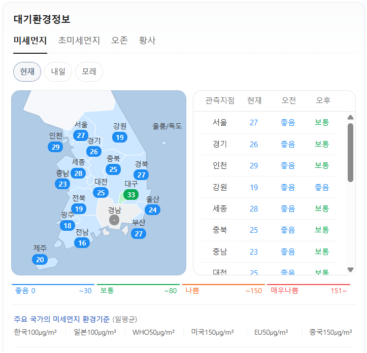 현재 미세먼지는 위와 같습니다. 오전 예보는 전국이 좋음입니다. 오후 예보는 서울, 경기, 인천, 세종, 충북, 충남, 대전, 전북은 보통이고, 그 외 지역은 좋음입니다.