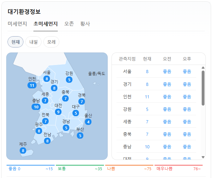 현재 초미세먼지는 위와 같습니다. 오전 예보, 오후 예보 모두 전국이 좋음입니다.
