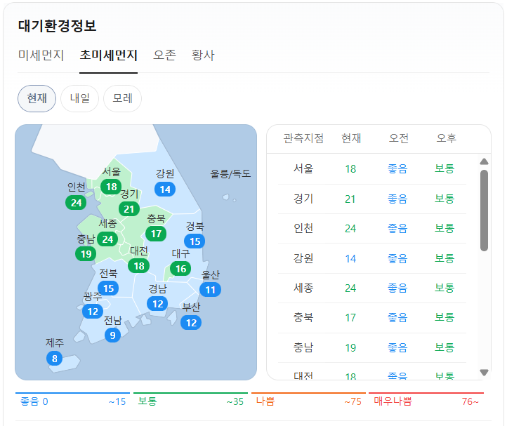 현재 초미세먼지는 위와 같습니다. 오전 예보는 전국이 좋음입니다. 오후 예보는 제주는 좋음이고, 그 외 지역은 보통입니다.