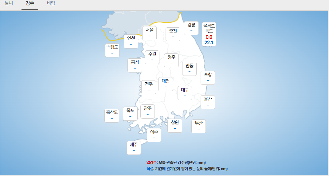 - (수도권) 서해 5도: 1mm 안팎