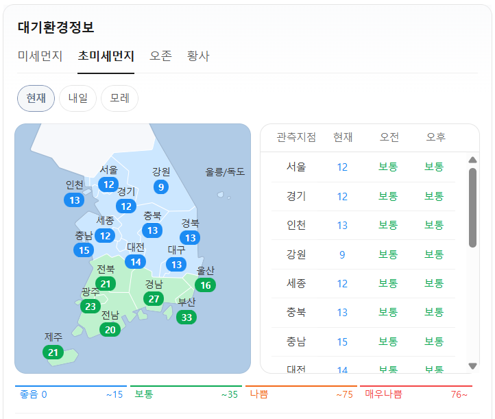 현재 초미세먼지는 위와 같습니다. 오전 예보, 오후 예보 모두 전국이 보통입니다.