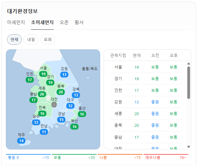 현재 초미세먼지는 위와 같습니다. 오전 예보는 서울, 경기, 인천은 보통이고, 그 외 지역은 좋음입니다. 오후 예보는 경북, 경남, 대구, 울산, 부산, 전남, 광주, 제주는 좋음이고, 그 외 지역은 보통입니다.
