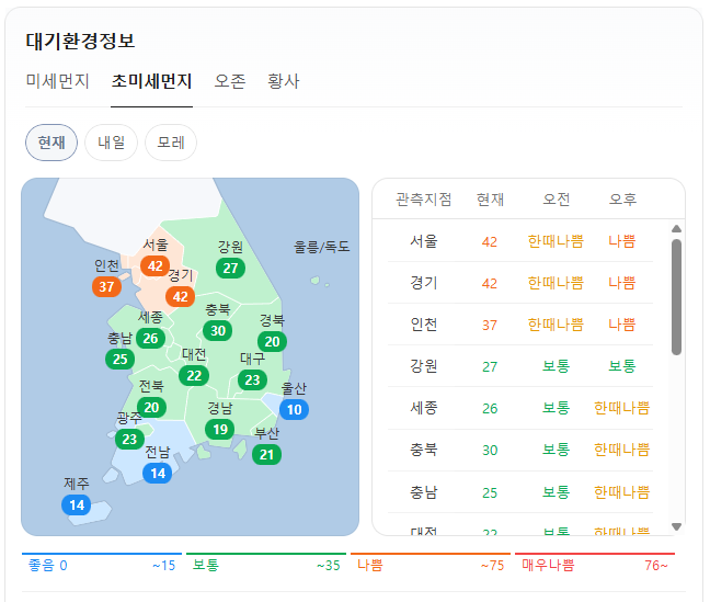 현재 초미세먼지는 위와 같습니다. 오전 예보는 서울, 경기, 인천은 한때 나쁨이고, 제주는 좋음이며, 그 외 지역은 보통입니다. 오후 예보는 서울, 경기, 인천은 나쁨이고, 세종, 충북, 충남, 대전은 한때 나쁨이며, 그 외 지역은 보통입니다.