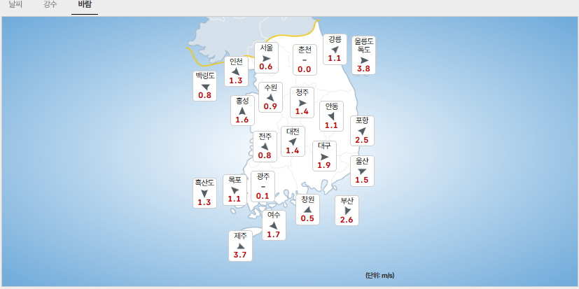 (강풍) 오늘(10일)과 내일(11일) 동해안과 제주도에 바람이 순간풍속 55km/h(15m/s) 안팎(산지 70km/h(20m/s) 안팎)으로 강하게 부는 곳이 있겠습니다.