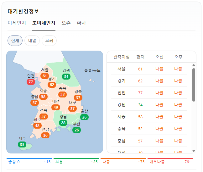 현재 초미세먼지는 위와 같습니다. 오전 예보는 경북, 경남, 대구, 울산, 부산은 보통이고, 그 외 지역은 나쁨입니다. 오후 예보는 전국이 나쁨입니다.