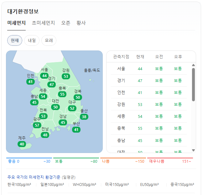 현재 미세먼지는 위와 같습니다. 오전 예보, 오후 예보 모두 전국이 보통입니다.