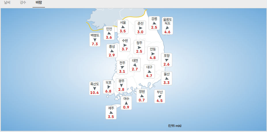 (강풍) 오늘(15일)은 전국 대부분 지역, 내일(16일)은 서해안과 제주도에 바람이 순간풍속 55km/h(15m/s) 안팎(산지 70km/h(20m/s) 안팎)으로 강하게 부는 곳이 있겠으니, 시설물 관리와 안전사고에 유의하기 바랍니다.