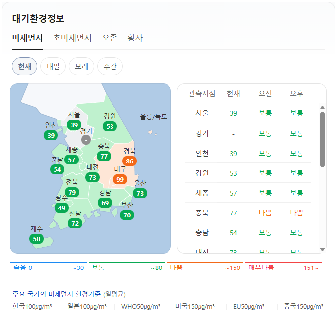 현재 미세먼지는 위와 같습니다. 오전 예보는 충북은 나쁨이고, 그 외 지역은 보통입니다. 오후 예보는 서울, 경기, 인천, 강원, 세종, 충남, 대전은 보통이고, 전북, 제주는 한때 나쁨이며, 그 외 지역은 나쁨입니다.