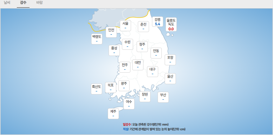 (내일 강수) 내일(18일) 오전(09~12시)부터 낮(12~15시) 사이 울릉도. 독도에 비 또는 눈이 내리겠습니다.