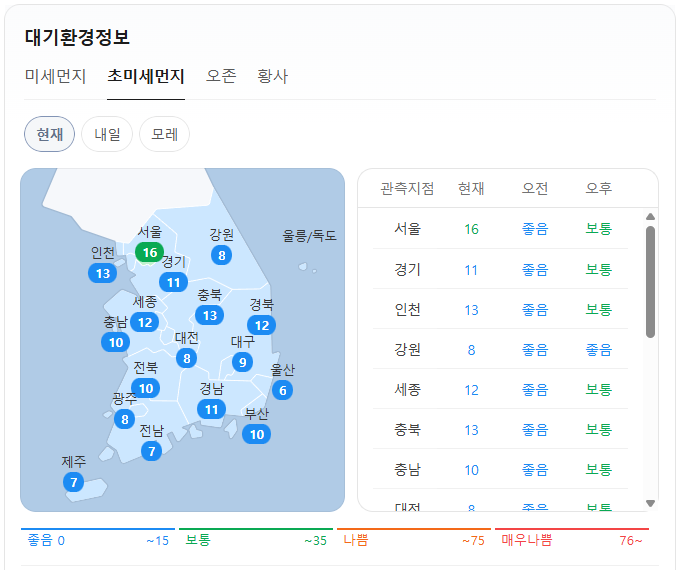 현재 초미세먼지는 위와 같습니다. 오전 예보는 전국이 좋음입니다. 오후 예보는 서울, 경기, 인천, 세종, 충북, 충남, 대전, 전북은 보통이고, 그 외 지역은 좋음입니다.