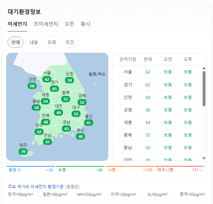현재 미세먼지는 위와 같습니다. 오전 예보, 오후 예보 모두 전국이 보통입니다.
