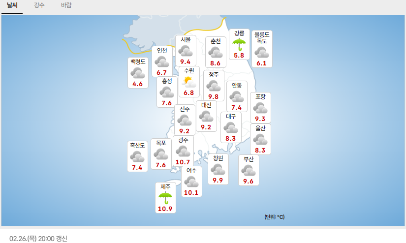오늘은 02월 26일 목요일입니다. 음력 01월 10일입니다.