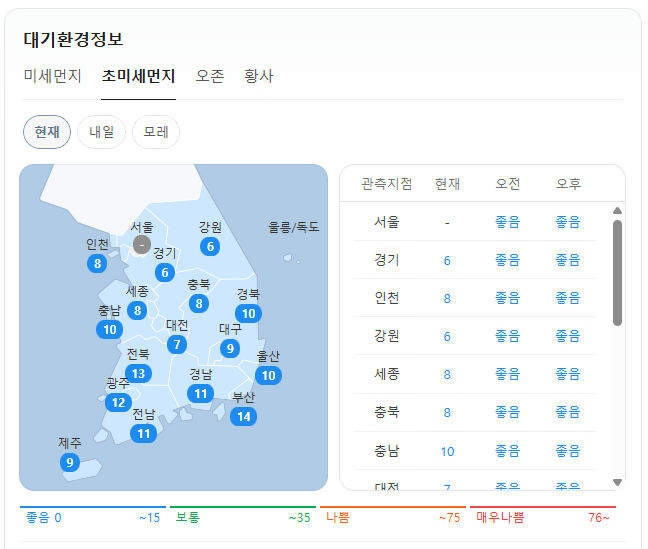 현재 초미세먼지는 위와 같습니다. 오전 예보, 오후 예보 모두 전국이 좋음입니다.